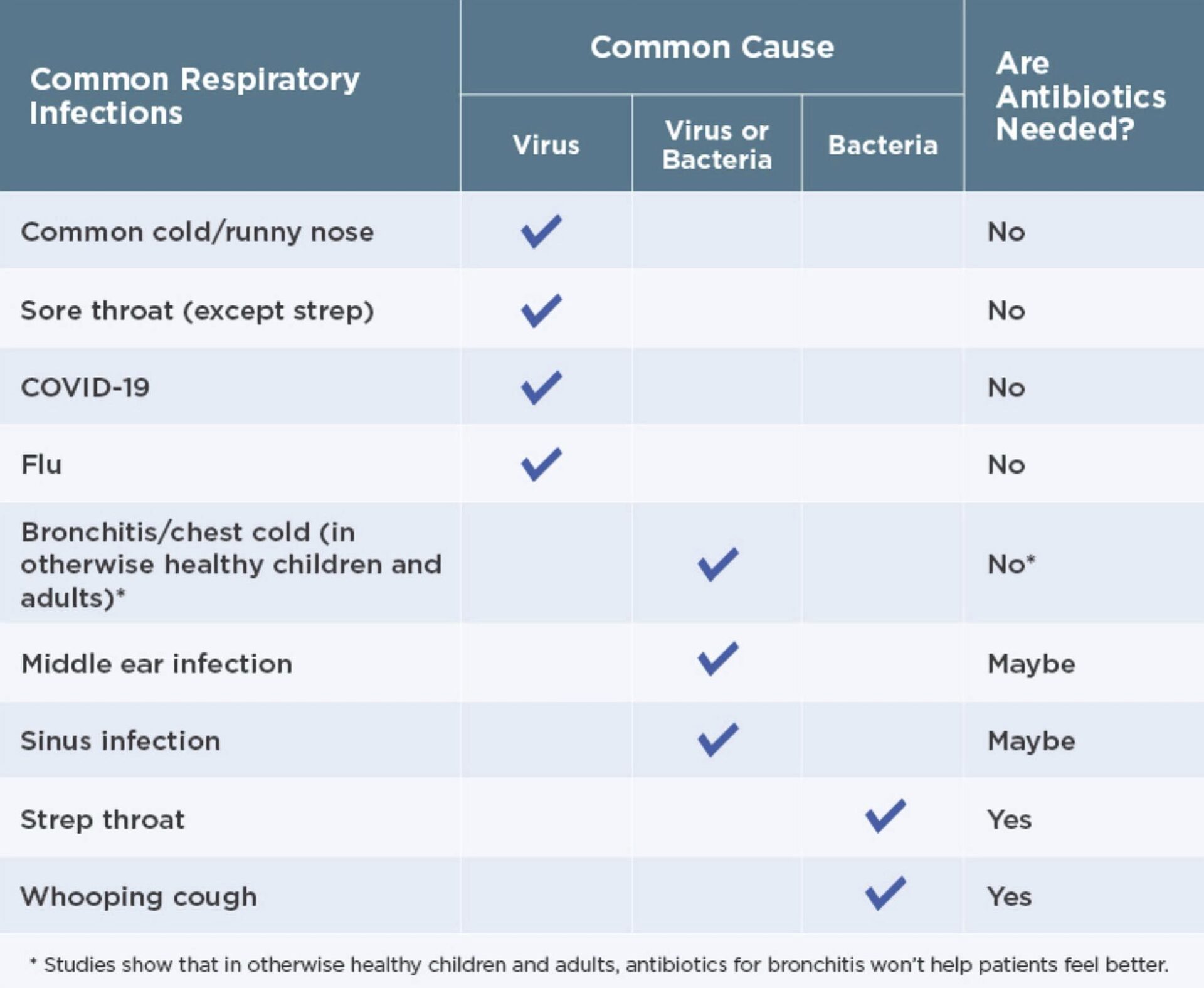 How often have you heard family members or friends saying they need to go to the doctor to get some antibiotics for a cough, cold, flu, rash, or even some ear infections? Unfortunately, many of these conditions don’t require antibiotics as shown in the table below. Antibiotics ONLY treat certain infections caused by bacteria (Strep throat, Whooping cough, Urinary tract infections) or treat life-threatening conditions caused by bacteria, such as sepsis, which is the body’s extreme response to infection.