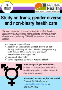 Hence this study in collaboration with Deakin researchers will provide a more in-depth account of barriers and facilitators to TGDNB health care at Kardinia Health, and what ideal care may look like in a regional or rural setting.